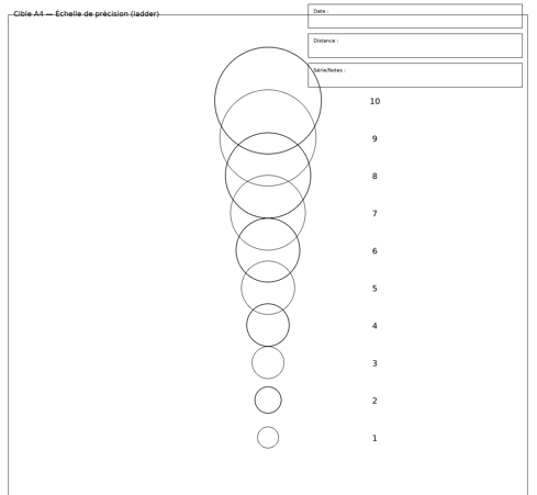 Idée. Une colonne de pastilles décroissantes (40→8 mm) pour objectiver la précision et le contrôle du lâcher.