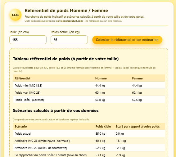 Fourchette de poids indicatif et scénarios calculés à partir de votre taille et de votre poids.