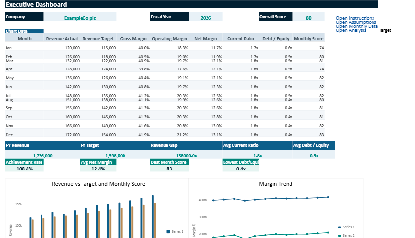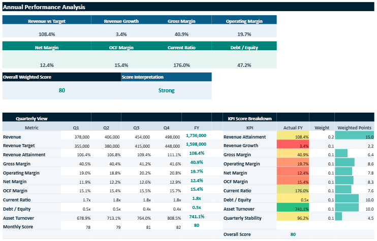 This Excel file is designed as a practical tool for evaluating a company’s performance in a clear and structured way. It brings together data entry, automatic calculations, and visual reporting in one place, so the user can move from raw figures to a more readable view of the business.