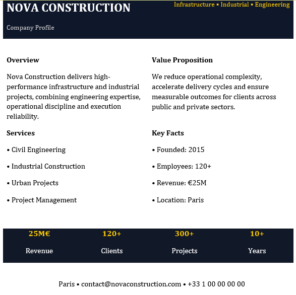 A few well-chosen figures can transform the perception of the document. Revenue ranges, number of projects, or size of the client base provide a sense of scale. They anchor the profile in reality.