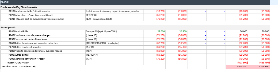 • Le passif : ce qui finance l’actif (fonds propres associatifs, dettes, ressources affectées, etc.).