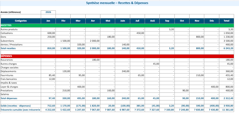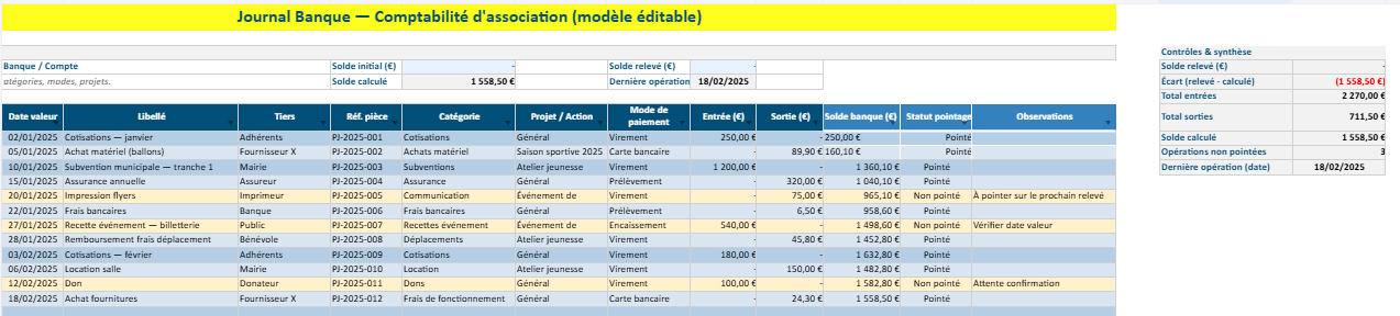 Un pack efficace comprend généralement : un journal de trésorerie (banque + caisse), un registre de pièces justificatives, un tableau de budget prévisionnel et réalisé, un tableau de pointage bancaire (réconciliation), un suivi des notes de frais, et une synthèse type “tableau de bord” (solde, répartition des dépenses, évolution mensuelle).
