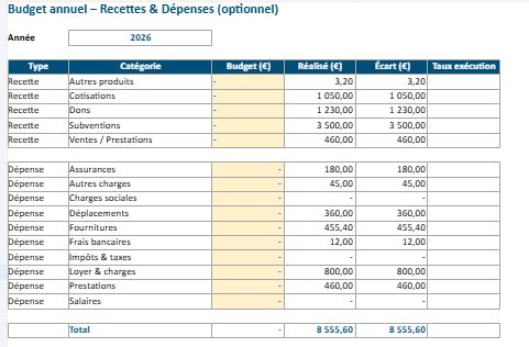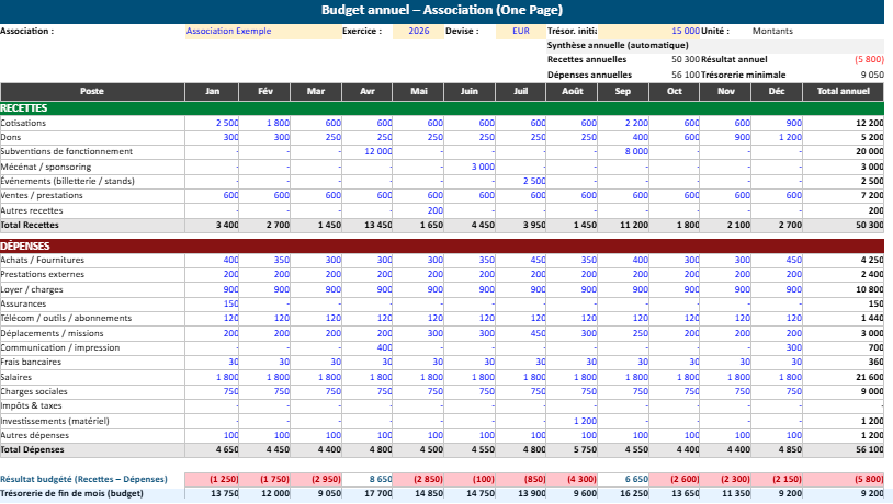5️⃣ Budget annuel Association – One Page (Excel automatisé)