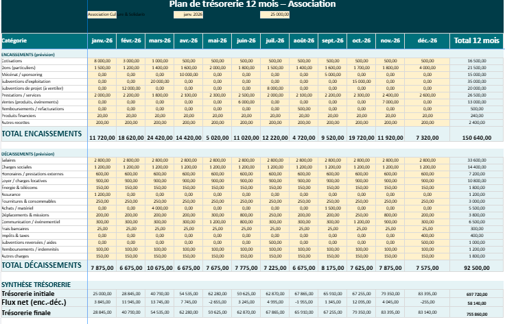 À partir de la trésorerie initiale, le modèle déroule la trésorerie de fin de mois (cumul). C’est la partie la plus utile pour repérer rapidement les mois tendus (décalage subventions/dépenses) et sécuriser le “creux” annuel.
