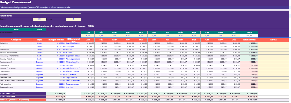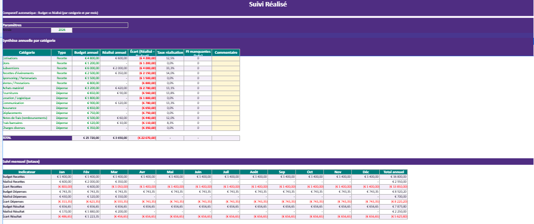 🟣Budget Association Prévisionnel vs Réalisé : Modèle Excel