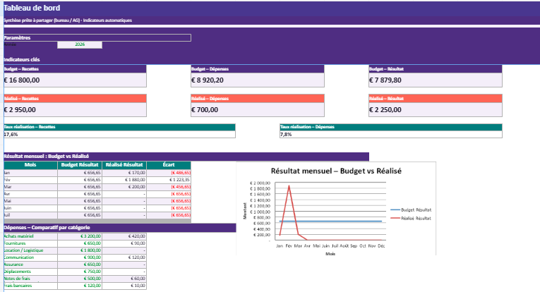 Ce modèle Excel permet de préparer un budget annuel, de saisir ou importer le réalisé, puis de suivre automatiquement les écarts (budget vs réel) avec des indicateurs prêts pour le bureau et l’AG. Il a été conçu pour rester simple à éditer, tout en offrant un niveau de contrôle “premium” (listes déroulantes, alertes, synthèses).
