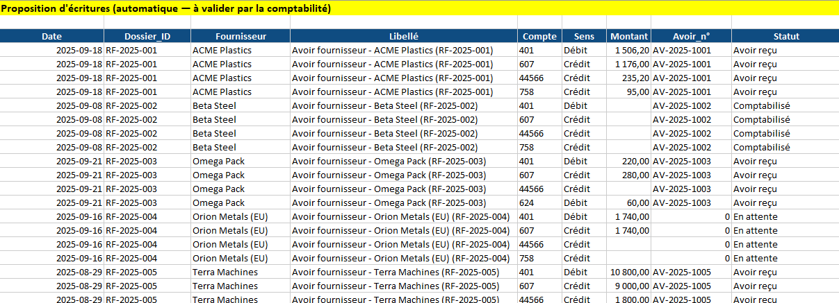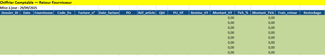 - RRR sans retour : mettez TVA_%, renseignez Remise_HT (Qté/PU peuvent rester 0) et, si politique interne, passez COMPTE_ACHAT_AVOIR = 609 dans Paramètres.