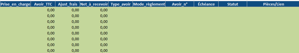 Montant_HT (L), Montant_TVA (N), Avoir_TTC (R), Ajust_frais (S), Net_à_recevoir (T).