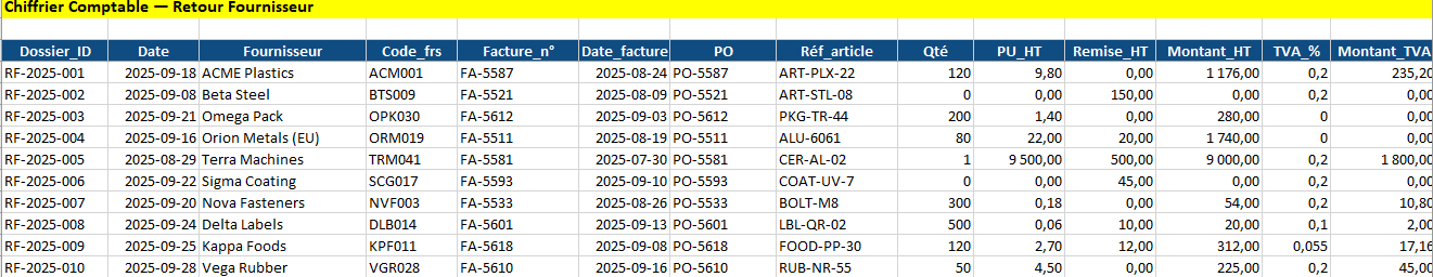 Ce fichier vous aide à enregistrer, valoriser et comptabiliser chaque retour fournisseur en quelques étapes, avec calculs automatiques (HT, TVA, net à recevoir) et un journal d’écritures prêt à intégrer dans votre ERP.