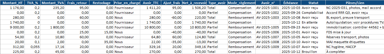 - Rassembler en une page ce que la comptabilité attend pour passer l’écriture sans ambiguïtés : facture d’origine, article/lot, quantités, valorisation HT/TVA, frais, type d’avoir, échéance.