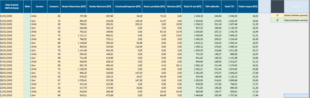 - Saisie_Ventes : vous saisissez vos ventes (HT) + couverts + remises → Excel calcule Total HT, TVA, TTC et le ticket moyen.