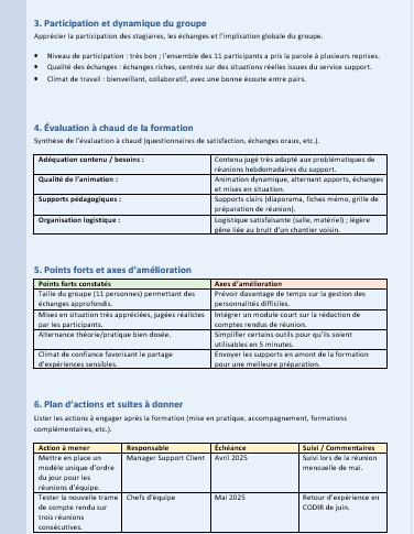 Les tableaux détaillent les séquences réalisées, les appréciations, les actions envisagées. Le lecteur repère rapidement les informations essentielles et peut comparer plusieurs sessions sur une même thématique. Ce format se prête bien à une intégration dans un SIRH ou un tableau de bord, avec des rubriques harmonisées d’une action à l’autre.