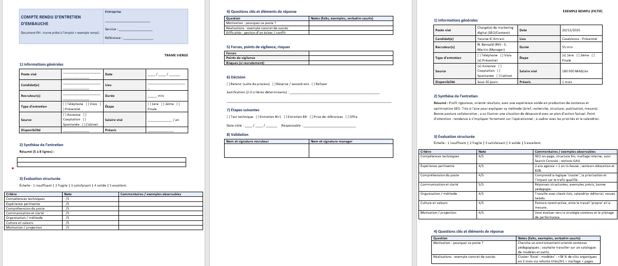 Avant même d’évaluer, le document doit situer l’entretien : poste, date, participants, format (présentiel/visio), durée, étape du process. Ces repères facilitent la traçabilité et évitent les confusions, notamment quand plusieurs postes sont ouverts en même temps.