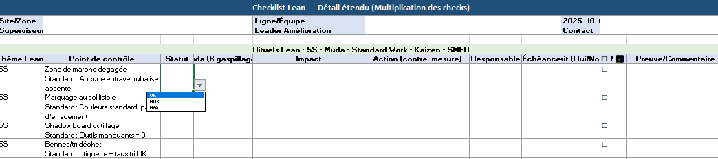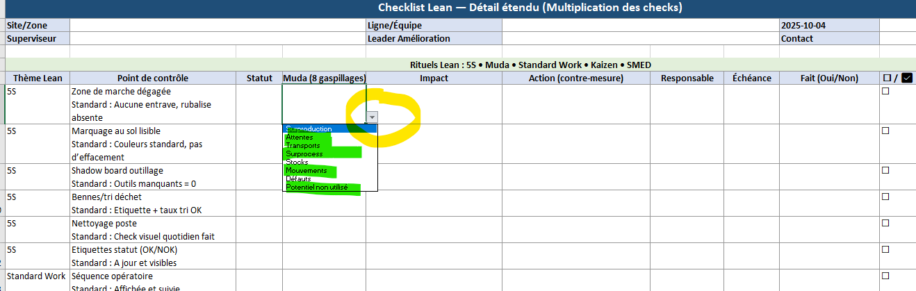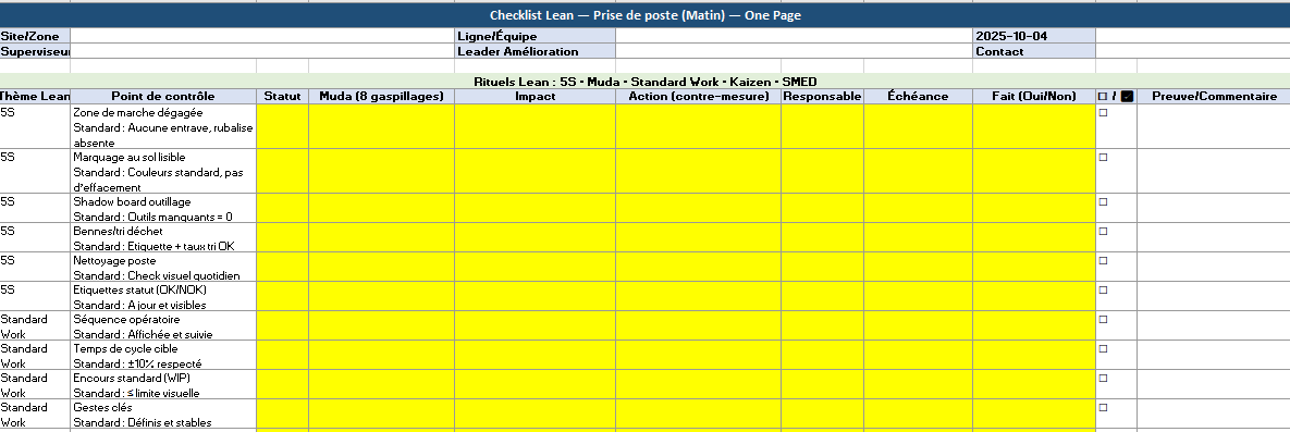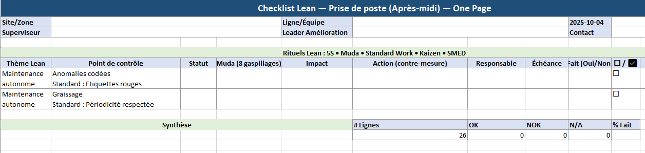 Checklists “une page A4” (prise de poste matin/après-midi/nuit). Menus déroulants (Statut, Muda, Impact, Responsable, Fait) + case dynamique ☑ liée à “Fait=Oui”. Couleurs auto (OK vert, NOK rouge, Impact H/M/B).