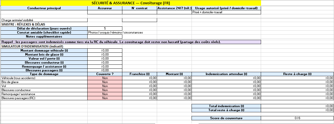 Covoiturage en France — Sécurité & Assurance : Modèle Excel de Calcul