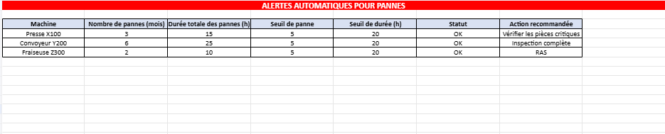 - Machine, nombre de pannes mensuelles, durée totale des pannes (heures), seuils de pannes et de durées, statut (OK ou ALERTE), et action recommandée.