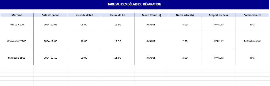 - Machine, date de panne, heure de début et de fin, durée totale (calculée automatiquement), durée cible, respect du délai (OK ou Non OK), et commentaires.