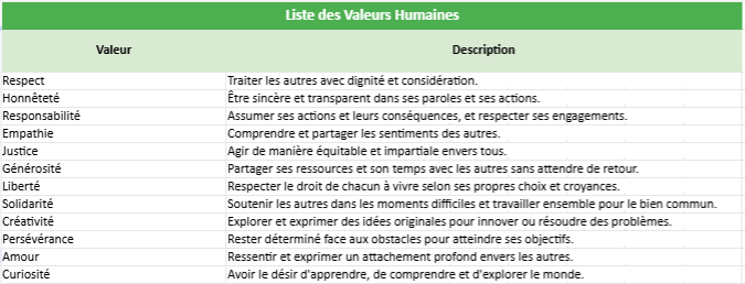 | Solidarité | Valeur sociale | Soutenir les autres et travailler pour le bien commun. |