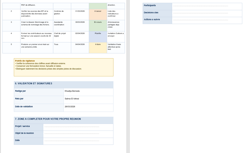 Le modèle permet de renseigner facilement les éléments importants d’une réunion :