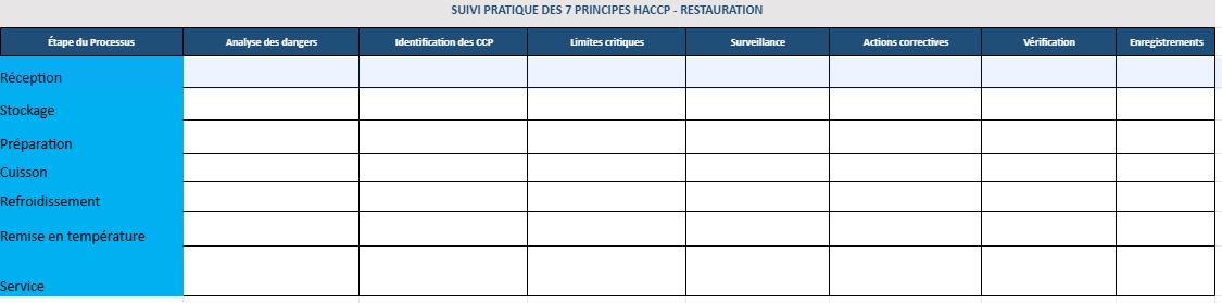 | Étape du Processus | Analyse des dangers | Identification des CCP | Limites critiques | Surveillance | Actions correctives | Vérification | Enregistrements |