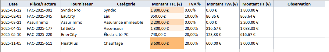 - Catégories : postes de charges (Syndic, Assurance, Eau, Électricité PC, Ascenseur, Chauffage, Entretien, Petites réparations) + clé associée.