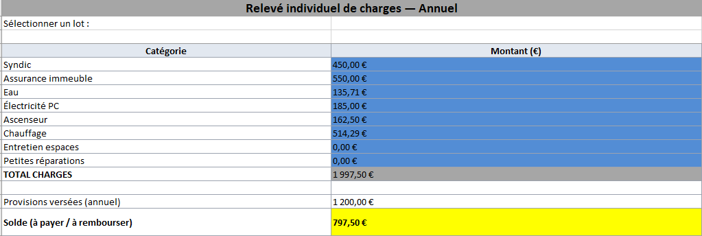 - Saisir la provision mensuelle prévue par lot → l’annuel se calcule (= mensuel × 12).
