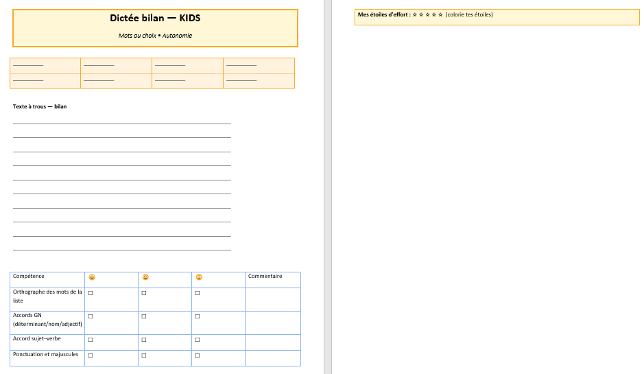 - Format paysage : plus de lignes pour la dictée bilan ou un travail à deux colonnes (écoute / auto-correction).