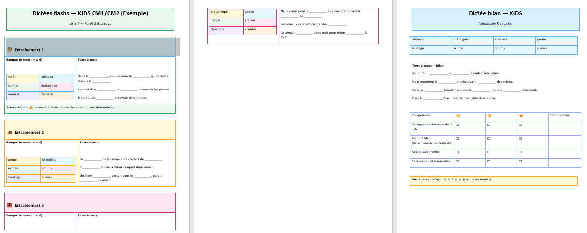 La dictée quotidienne n’a pas besoin d’être austère. En adoptant une mise en page accueillante, des codes couleurs rassurants et des repères visuels clairs, on transforme l’exercice en un moment attendu de la journée. Le modèle Dictées flashs — KIDS CM1/CM2 répond à cet objectif : trois entraînements courts + une dictée bilan dans un design pensé pour les enfants, avec banques de mots en cases pastel, cartes d’activité, astuce du jour et grille de compétences à pictogrammes. L’ensemble est prêt à imprimer, modulable et facile à différencier selon les profils du groupe.