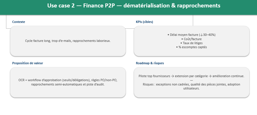 • Contexte : 1–2 phrases business (“Aujourd’hui, le cycle facture = 9 jours, 8 % de litiges, charge cachée significative”).