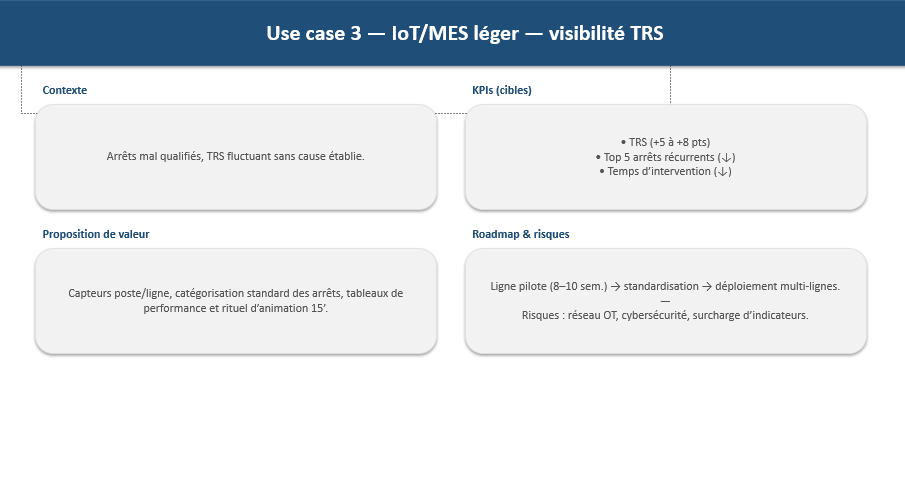 Roadmap & risques. Ligne pilote (8–10 sem.), standardisation, déploiement multi-lignes. Risques : réseau OT, cybersécurité, surcharge d’indicateurs.