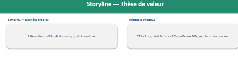 3 leviers : (1) Données propres, (2) Intégration sobre, (3) Adoption terrain. Résultats attendus (ex. TRS +5 pts, délai facture −30 %, 30 % self-care).