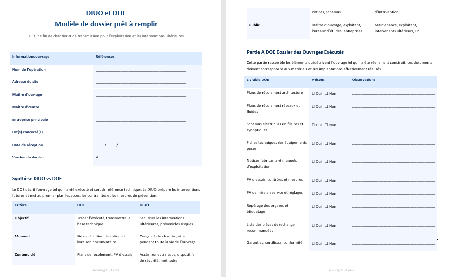 Cette distinction se lit aussi dans le type d’informations. Le DOE est riche en plans, fiches techniques, schémas, PV d’essais, notices, repérages. Le DIUO, lui, met en avant les accès, les contraintes, les points sensibles, les procédures d’intervention, et la manière dont la sécurité a été pensée et doit être préservée.