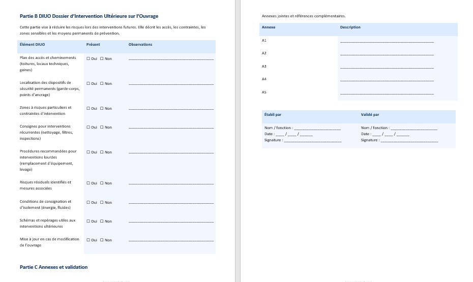 Le DIUO, ou Dossier d’Intervention Ultérieure sur l’Ouvrage, répond à une logique différente. Son cœur, ce n’est pas la description de l’exécuté, mais la prévention des risques lors des opérations futures : maintenance, remplacement d’équipements, inspection, nettoyage, accès en toiture, interventions en gaines, travaux de réaménagement, etc. Le DIUO met l’accent sur les moyens d’accès, les dispositifs de sécurité, les zones à risques, et les méthodes d’intervention recommandées pour éviter que l’exploitation ne devienne un terrain d’improvisation.