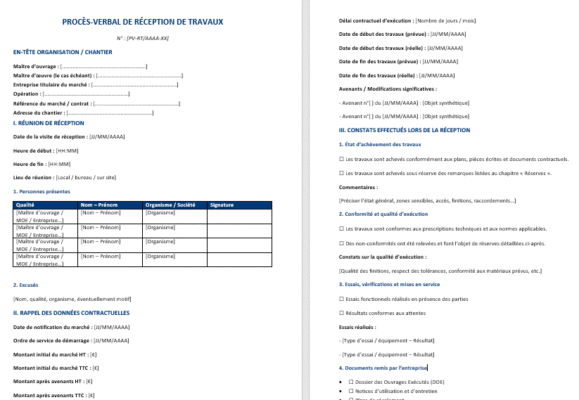 Un modèle structuré en rubriques (en-tête, réunion, données contractuelles, constats, décision, réserves, effets, signatures) devient un outil de gouvernance : il donne le ton d’une réception rigoureuse, documentée, professionnelle.