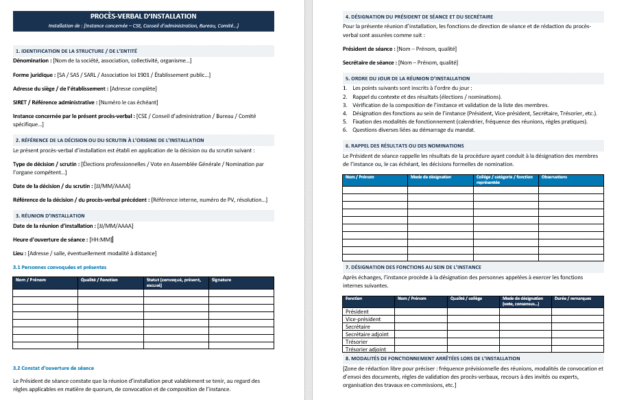 Un même modèle de procès-verbal d’installation accompagne différents contextes : mise en place d’un CSE après des élections, renouvellement d’un bureau associatif, installation d’un comité de pilotage sur un projet stratégique, lancement d’un conseil consultatif.