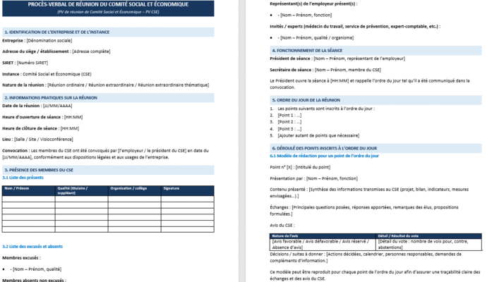 Avec cette trame, le PV CSE de réunion de Comité social et économique prend la place qui lui revient : un document de référence, structuré, exploitable et respectueux de la parole de chacun, au service d’un dialogue social suivi dans le temps.