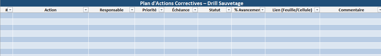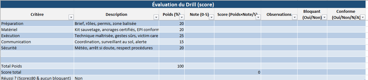Vous pouvez partir du modèle Excel “Fiche de Drill Sauvetage – Travail en hauteur” que j’ai préparé :