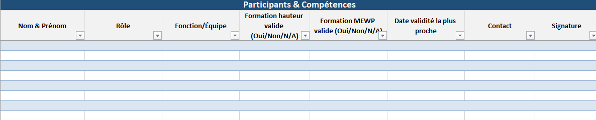 - Rôles & compétences : personnes, formations valides (hauteur/MEWP), signatures.
