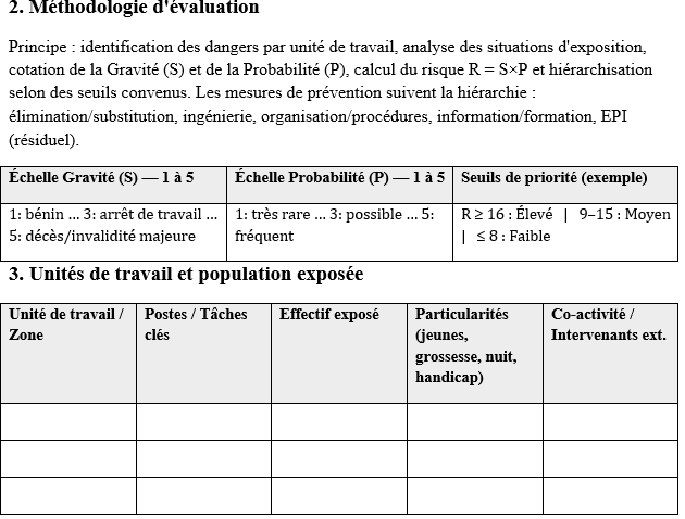 L’entrée en matière présente l’entreprise, le périmètre et les interlocuteurs. Suit un chapitre méthodologique bref où l’on définit l’échelle de gravité et de probabilité et la manière de calculer le niveau de risque. Vient ensuite le cœur : les unités de travail et l’inventaire des dangers, puis la cotation S×P avec une justification concise. La hiérarchie des mesures de prévention structure l’action : éliminer quand c’est possible, substituer, concevoir des protections techniques, organiser le travail, former, conserver l’EPI comme ultime filet. Un plan d’action convertit les priorités en engagements datés. Les dernières pages rassemblent la consultation CSE/CSSCT, le registre des versions et les modalités de diffusion.