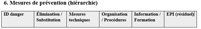 ☐ Le DUER intègre la hiérarchie de prévention (élimination → substitution → technique → organisation → formation → EPI).