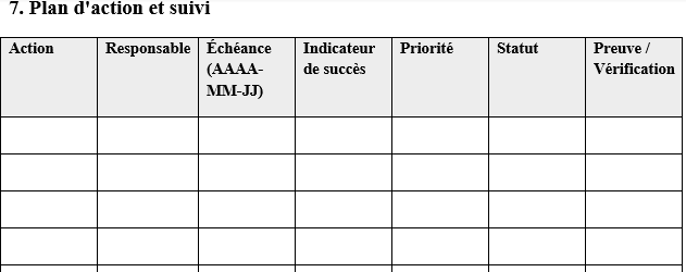 ☐ Chaque action indique : responsable nommé, échéance datée, indicateur de succès, preuve de réalisation.
