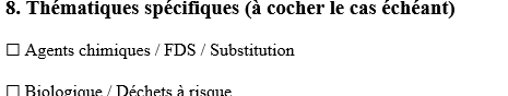 ☐ Biologiques : exposition, procédures déchets à risque, vaccination/mesures barrières si applicable.