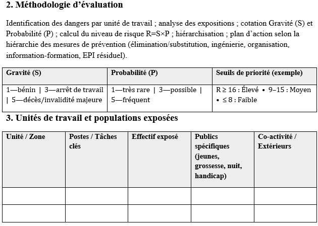 - Unités de travail : description synthétique des zones, tâches clés, effectifs exposés, publics spécifiques, co-activité.