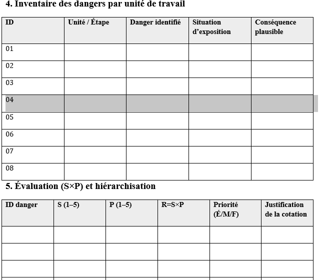 - Inventaire des dangers : tableau “ID — unité/étape — danger — situation d’exposition — conséquence plausible”.
