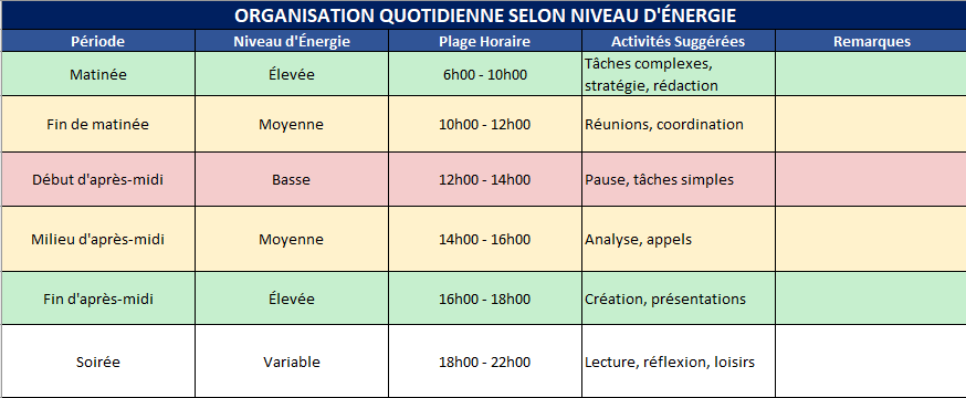 Un modèle éditorial qui découpe votre journée selon le niveau d’énergie attendu. Par exemple :