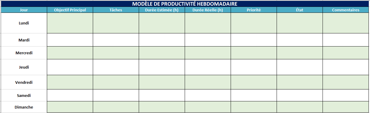 💡 Astuce : vous pouvez dupliquer la feuille pour chaque semaine, et ainsi suivre votre rythme dans le temps.