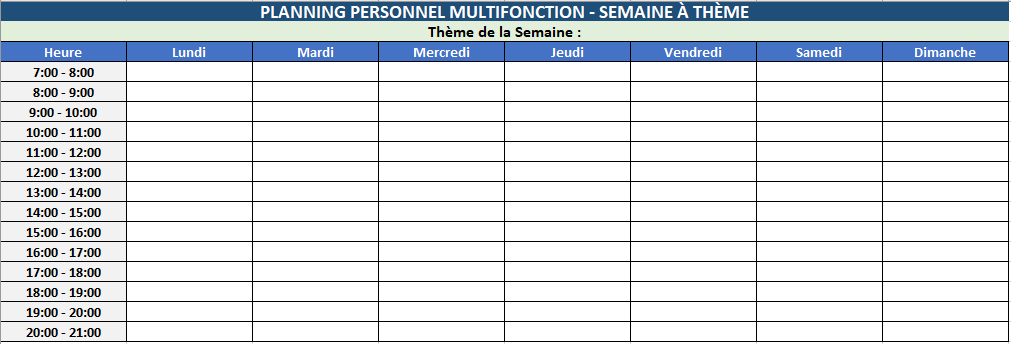 Un modèle multi-usages divisé par thèmes (cours, sport, famille, etc.) avec un champ “Thème de la semaine” en haut du tableau. Idéal pour organiser des semaines à thème ou des routines variées.