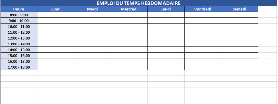 Le point de départ idéal : un emploi du temps hebdomadaire vierge, structuré du lundi au samedi avec des horaires de 8h à 17h.