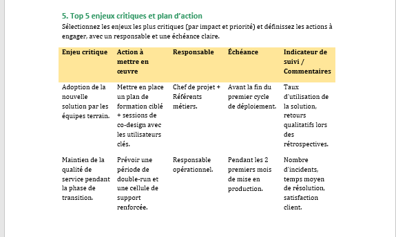 - Enfin, la fiche invite à sélectionner quelques enjeux « critiques » – ceux qui, s’ils ne sont pas traités, peuvent faire dérailler le projet ou le vider de son sens. Pour chacun, un mini plan d’action est posé : quelles actions, qui porte, pour quand, comment saura-t-on que l’enjeu est sécurisé ?