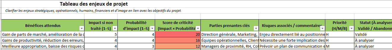 Plutôt que de considérer les enjeux de manière abstraite, Excel permet d’attribuer :- une note d’impact (par exemple de 1 à 5),